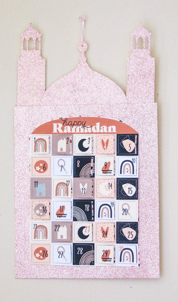 I made a Ramadan Calendar! This is a fun way to do little activities with your child. The flap opens so you can reveal something new everyday. I also chose to include little prizes after each activity so that my daughter would be excited for the next day’s activity. This project only cost me $7. I purchased this beautiful printable calendar from PENCES MODERN EID on Etsy. You can find it here . I used rose gold card stock available at Micheals or any local craft store.